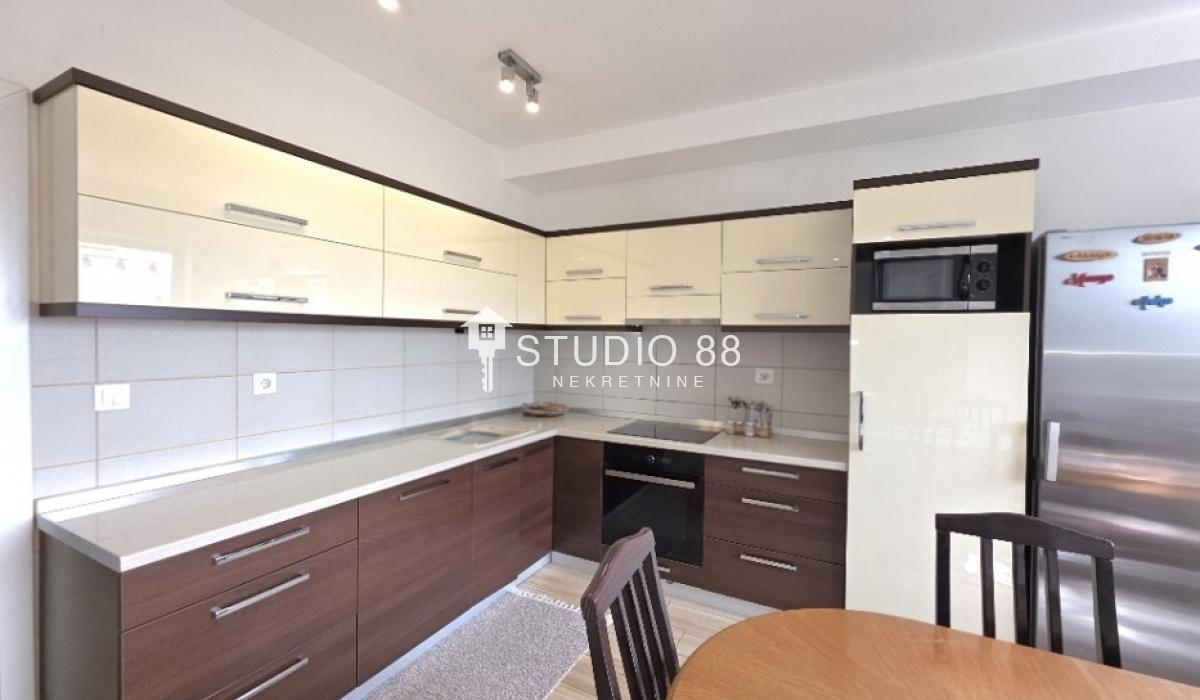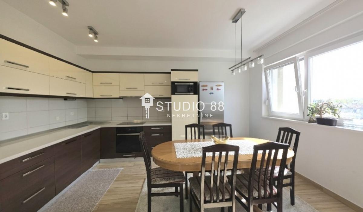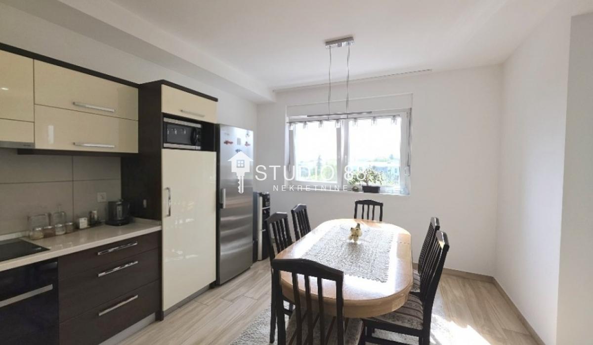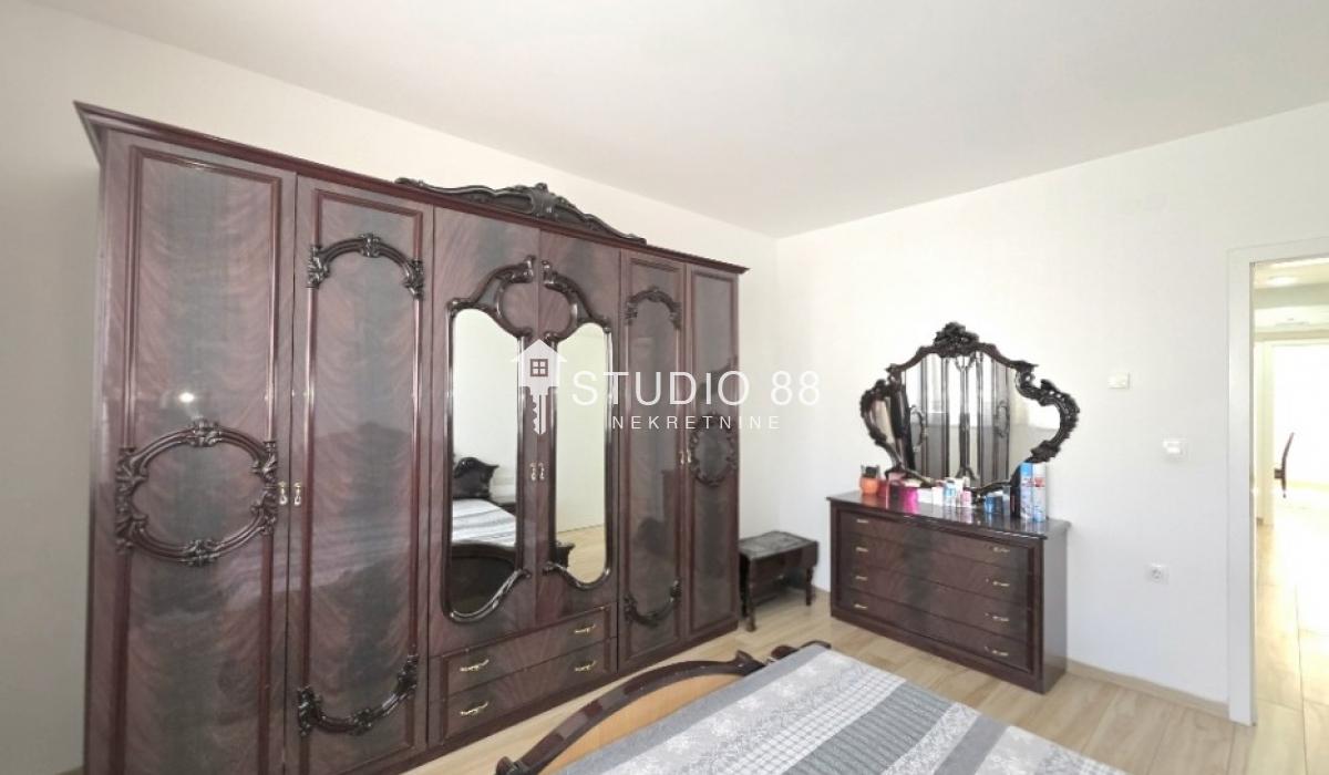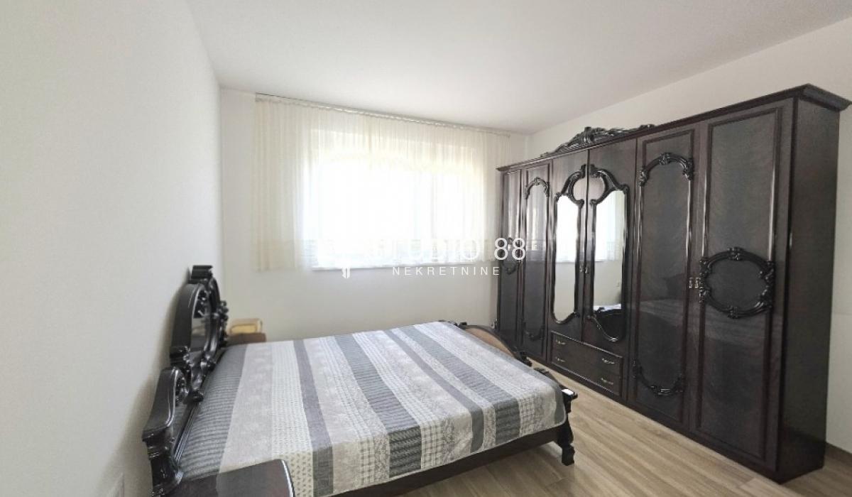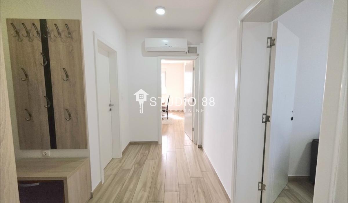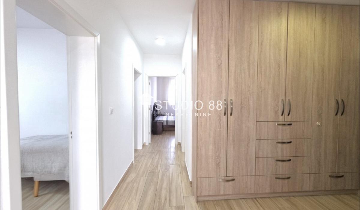 Četvorosban stan u širem centru grada, površine 103m2, na drugom od tri sprata novije stambene zgade, trostrano orijentisan. Stan se sastoji od hodnika, trpezarije sa kuhinjom, dnevnog boravka koji ima izlaz na jednu terasu, tri spavaće sobe od kojih jedna ima izlaz na drugu terasu, kupatila i toaleta. Po podovima granitna keramika, grejanje podno po sistemu toplotnih pumpi gde svaka soba ima mogućnost individualnog podešavanja temperature, hlađenje fan coil sistem sa dve jedinice, PVC stolarija, sigurnosna ulazna vrata, demit fasada, inetrfon.