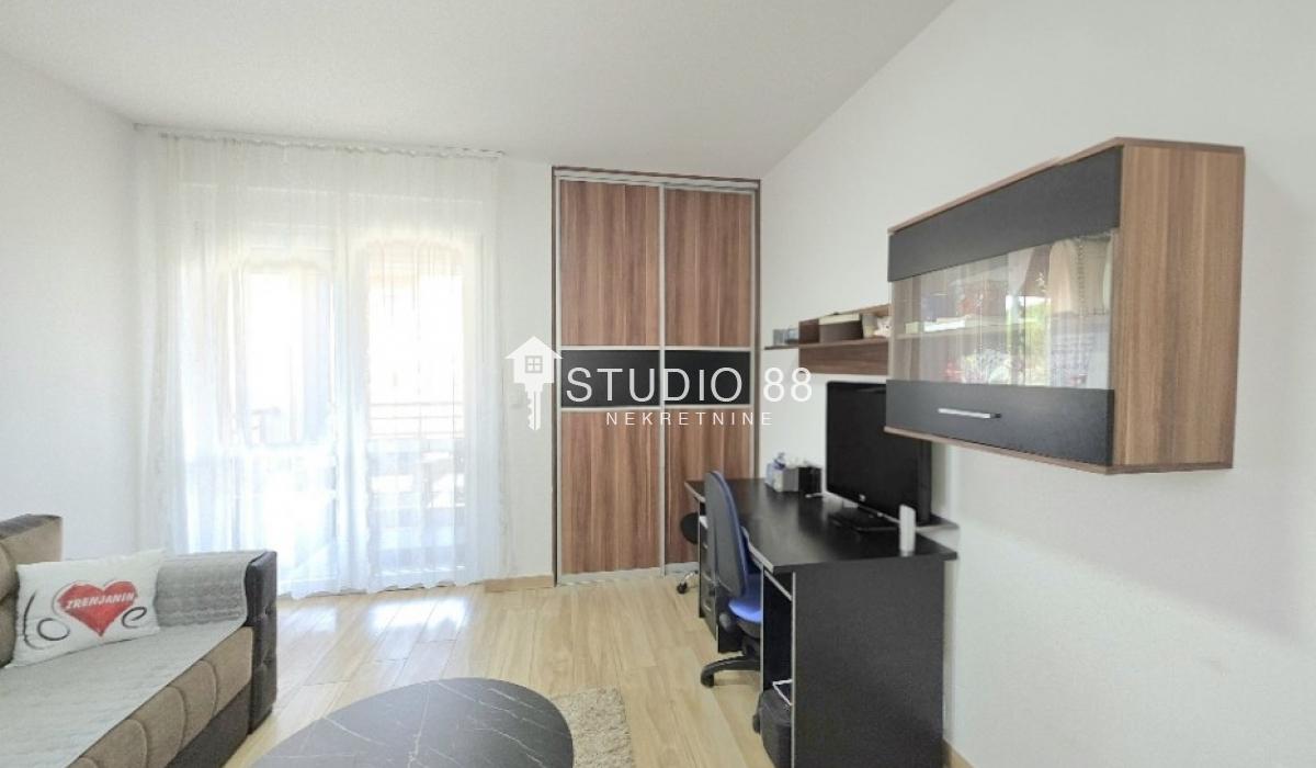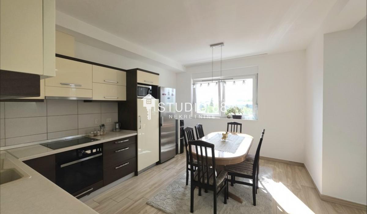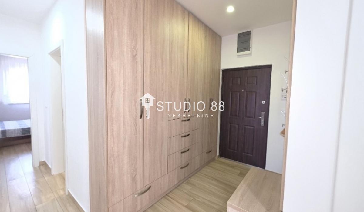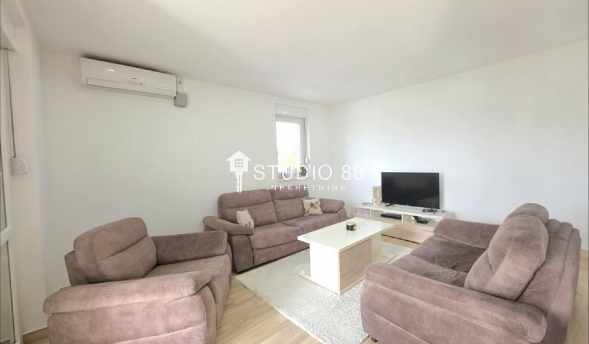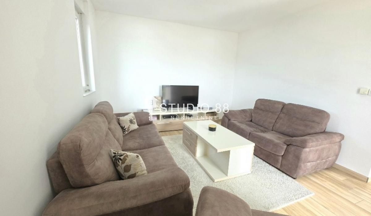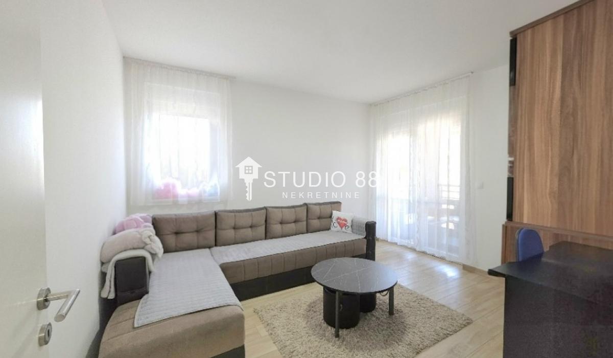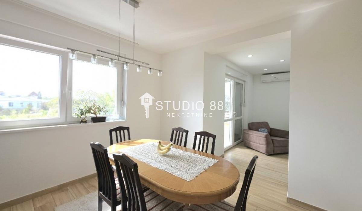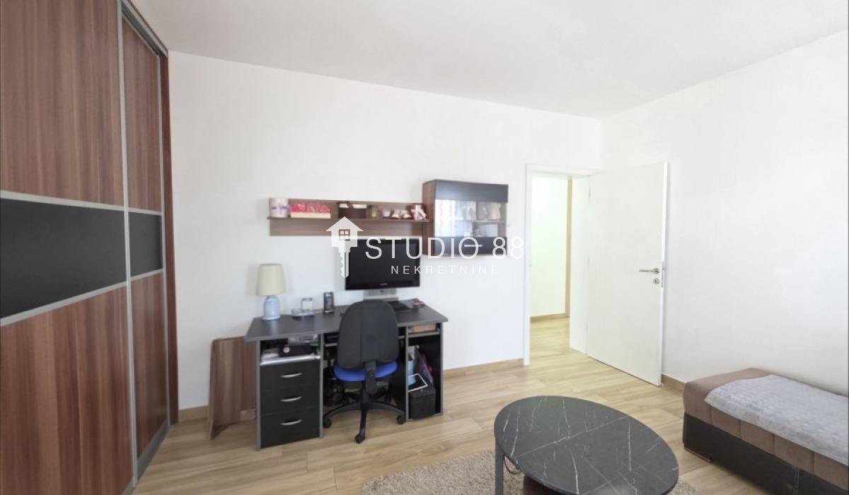 Četvorosban stan u širem centru grada, površine 103m2, na drugom od tri sprata novije stambene zgade, trostrano orijentisan. Stan se sastoji od hodnika, trpezarije sa kuhinjom, dnevnog boravka koji ima izlaz na jednu terasu, tri spavaće sobe od kojih jedna ima izlaz na drugu terasu, kupatila i toaleta. Po podovima granitna keramika, grejanje podno po sistemu toplotnih pumpi gde svaka soba ima mogućnost individualnog podešavanja temperature, hlađenje fan coil sistem sa dve jedinice, PVC stolarija, sigurnosna ulazna vrata, demit fasada, inetrfon.